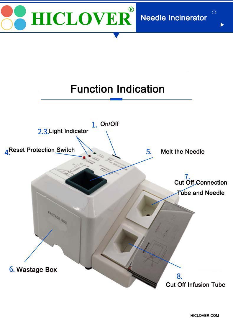1. For clinic,lab, small hospital with low waste output capacity, no condition with other medical waste treatment(Underdeveloped country or area, or emergency situations ).2. Doctor, nurse treat the syringes, needle, infusion set immediately after use, plug to play, no dispersion risk.3. melting the syringes needle with 1250Celsius high temperature to metal slag, sterilization immediately. Destroy syringes, infusion set, can not use again.Medical Needle Incinerator: Melt the needle waste, cut off syring tube with needle, cut off the infusion tube.Model SYC19, Price: $110usd/set, MOQ: 5 sets.EXW factory term(donot including shipping cost)Purchase email: info@clovertech.com.cnQustion1: If request 1-4 set only, how to do?Answer: We will plus $50-$200usd fee per order.Qustion2: If request more than 5 sets only, any discount?Answer: We will supply discount quotation accordingly.